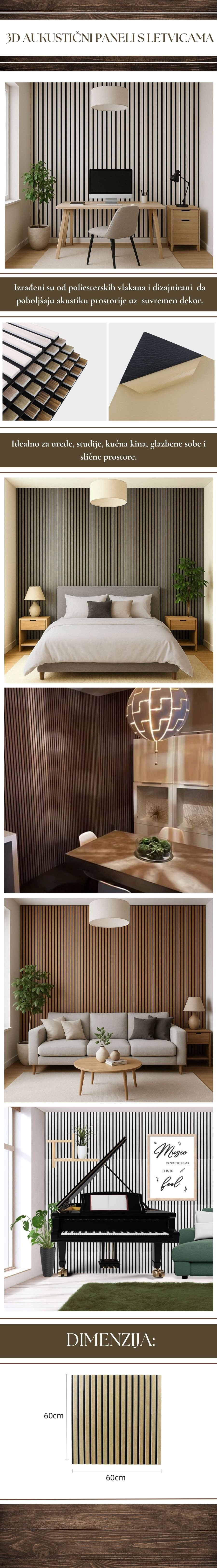 Zvučna izolacija i apsorpcija: Paneli učinkovito upijaju zvučne valove te smanjuju odjeke i buku – idealno za urede, studije, kućna kina, glazbene sobe i slične prostore.