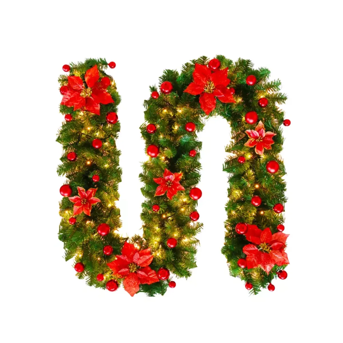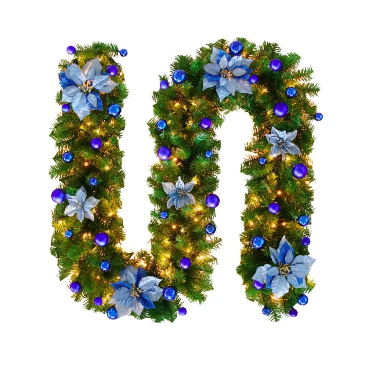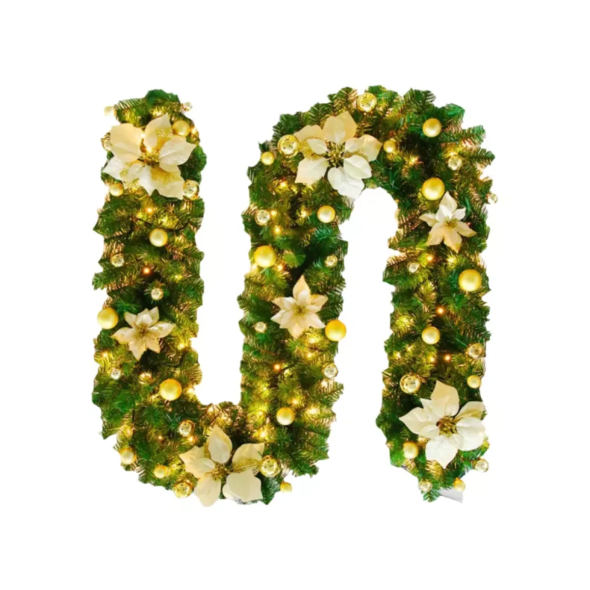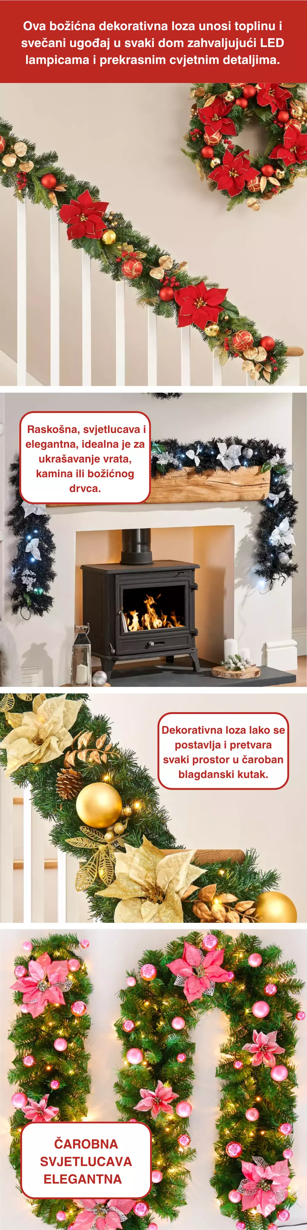 Unesite čaroliju blagdana u svoj dom uz prekrasnu božićnu lozu dužine 2,7 metara. Ova bogata, bujna i svjetleća dekoracija idealna je za ukrašavanje vrata, stubišta, kamina ili božićnog drvca. Dostupna je u četiri elegantne kombinacije boja – zlatnoj, crvenoj, plavoj i rozoj – kako bi se savršeno uklopila u svaki blagdanski stil. Loza je izrađena od kvalitetnih materijala, a LED lampice ravnomjerno osvjetljavaju svaki segment, stvarajući toplu i svečanu atmosferu. Jednostavna je za postavljanje i idealna za unutarnju dekoraciju tijekom cijele blagdanske sezone.