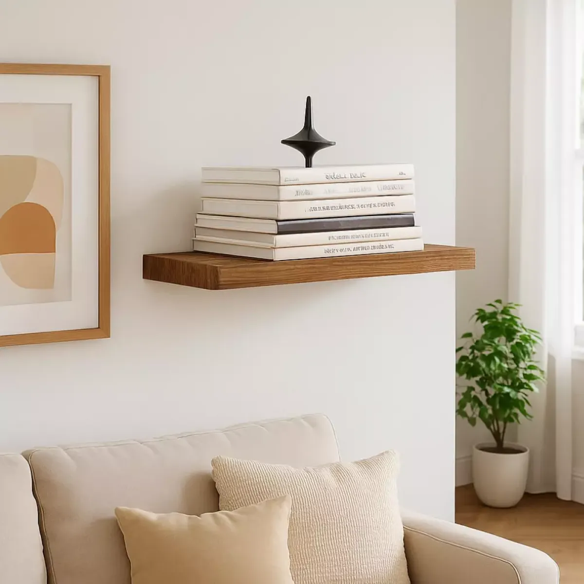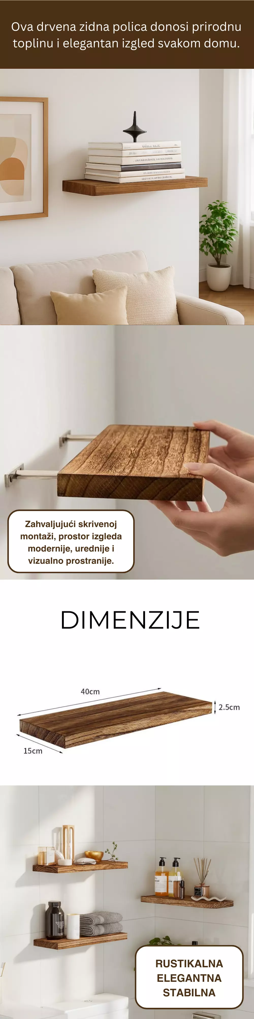 Unesite toplinu prirodnog drva u svoj dom uz ovu elegantnu zidnu policu izrađenu od kvalitetnog i izdržljivog materijala. Minimalistički dizajn savršeno se uklapa u svaki interijer – dnevni boravak, kuhinju, hodnik ili radni prostor. Polica je idealna za dekoracije, biljke, svijeće, fotografije i druge sitnice koje želite istaknuti. Zahvaljujući skrivenom sustavu montaže, postavljanje je brzo i jednostavno, a polica izgleda kao da lebdi na zidu, dajući prostoru moderan i uredan izgled. Drvena površina ima prirodnu teksturu koja prostoru daje dodatnu toplinu i estetsku vrijednost.