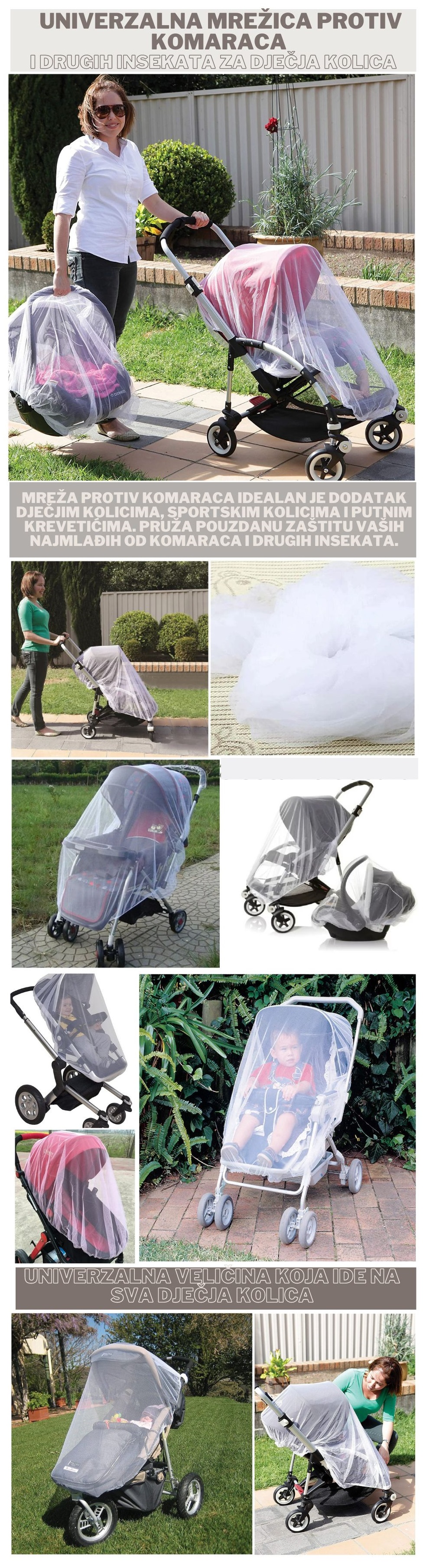 Mreža proti komarjem, ki jo namestimo na otroški voziček. Mreža se namesti s pomočjo elastike, ki na robu mreže.- Mreža za komarje je narejena iz tanke in goste mreže.