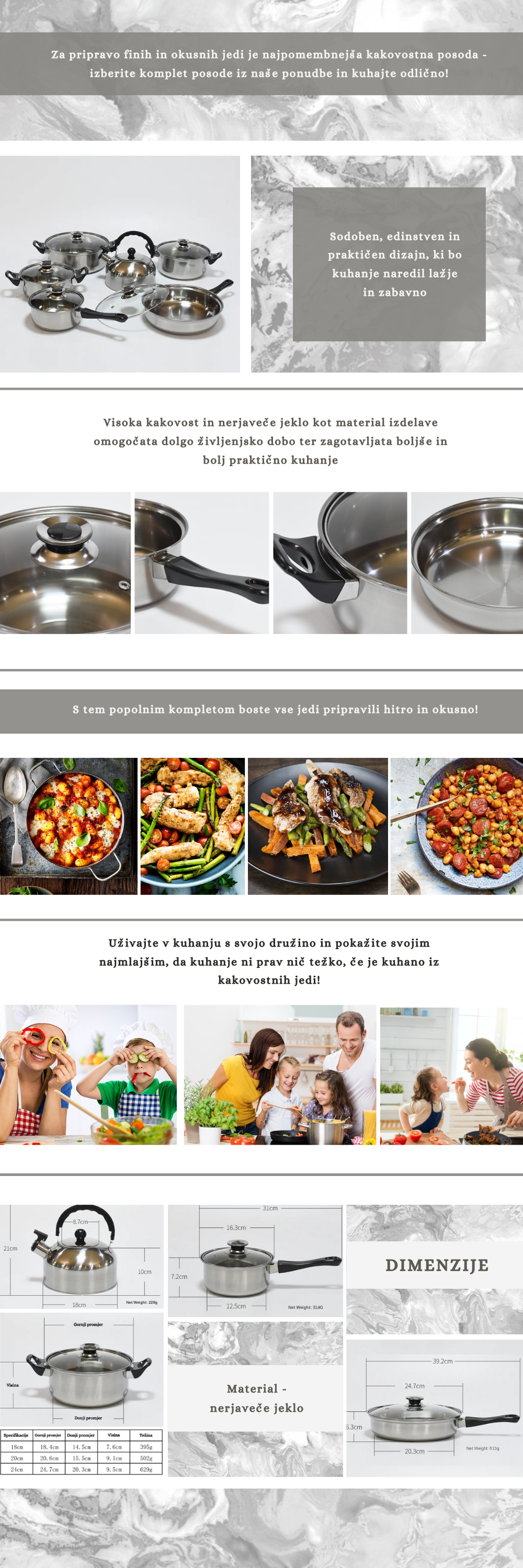 Ste mislili, da popoln komplet posode ne obstaja? To ni res! Komplet 6 kakovostnih in dolgotrajnih posod iz nerjavečega jekla je idealna izbira za vas. S tem setom kuhanje še nikoli ni bilo lažje, zanimivejše in preprostejše!Izdelano iz nerjavečega jekla za enakomerno porazdelitev toplote. Prozoren pokrov iz kaljenega stekla z odprtinami za paro za vizualizacijo procesa kuhanja in lažji nadzor toplote.Združljiv z vsemi vrstami štedilnikov kot so plinski, električni, halogenski, indukcijski itd.