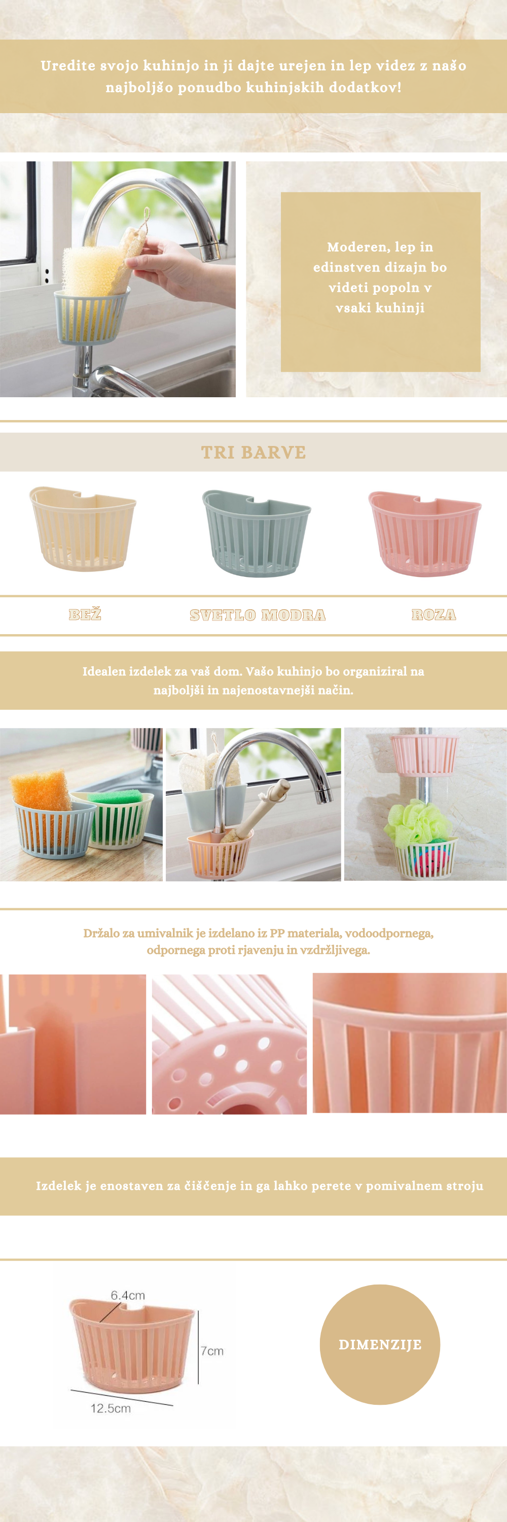 Držalo za gobo za pomivalno korito naredi vašo kuhinjo bolj urejeno, lepšo in bolj organizirano. Na dnu držala so odprtine, da se voda ne nabira v notranjosti. Moderen, lep in praktičen dizajn, ki se bo podal v vsako kuhinjo!Ta vrsta držala za odcejalnik se lahko uporablja za shranjevanje krtač, gobic, brisač, krp in drugih manjših predmetov, tako da vaša delovna površina in umivalnik ostaneta organizirana.
