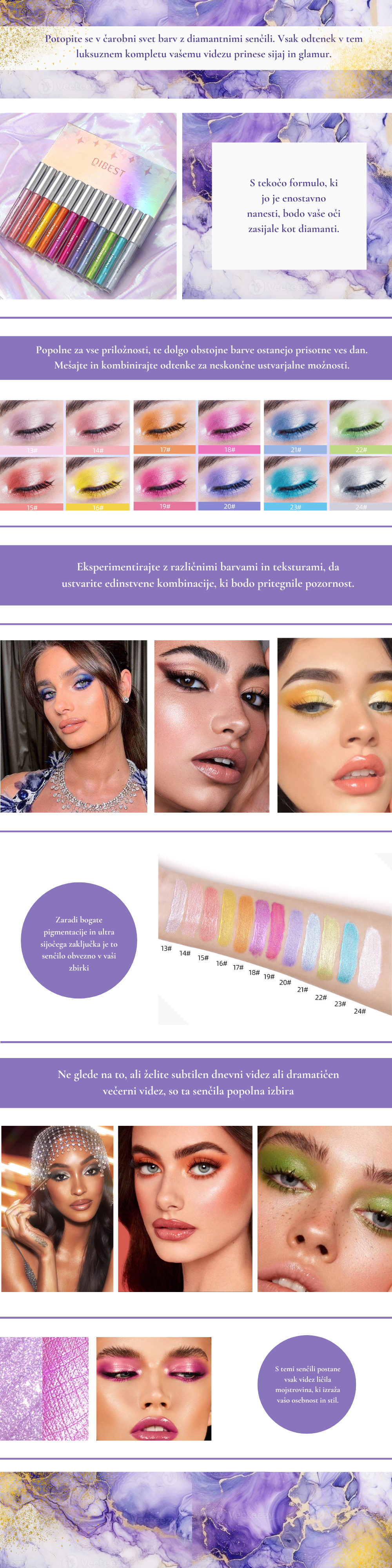 Ta čudovit set 12 kosov diamantnih senčil za oči prinaša vašemu pogledu neverjeten sijaj in eleganco. Popolna kombinacija tekočih svetlečih senčil s sedefastim in ultra svetlečim slojem ustvarja očarljiv videz, idealen za vsako priložnost. Senčila so enostavna za nanos in so na voljo v različnih barvah, kar vam omogoča, da eksperimentirate in ustvarjate različne stile. Mat zaključna obdelava zagotavlja dolgo obstojnost in trajnost, medtem ko visoko kakovostna formula nudi prijeten občutek na vekah.
