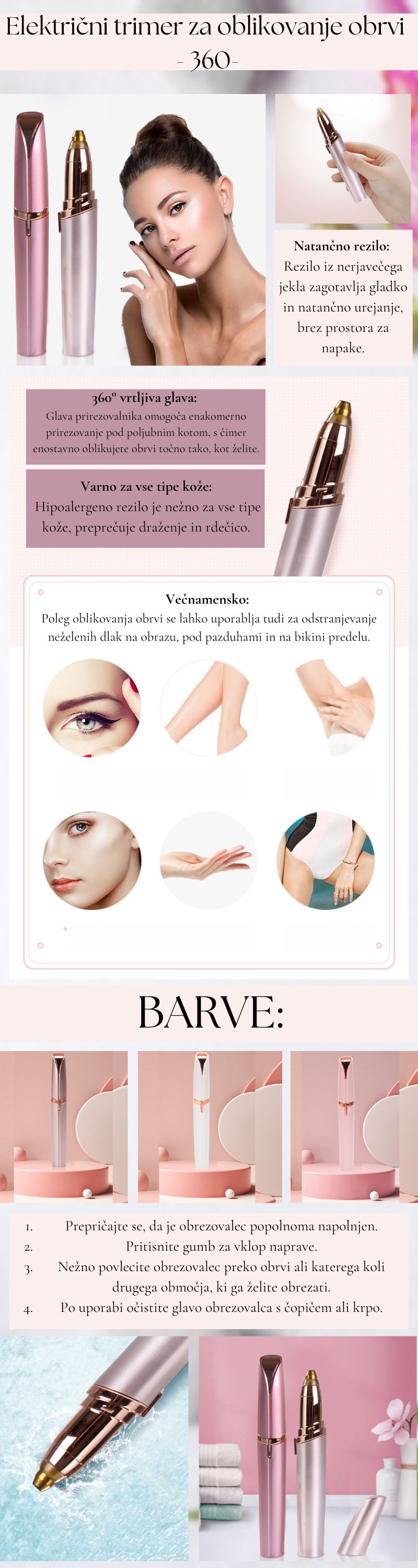 - Večnamenski: Poleg obrezovanja obrvi se lahko uporablja tudi za odstranjevanje neželenih dlak na obrazu, pod pazduhami in v predelu bikinija.