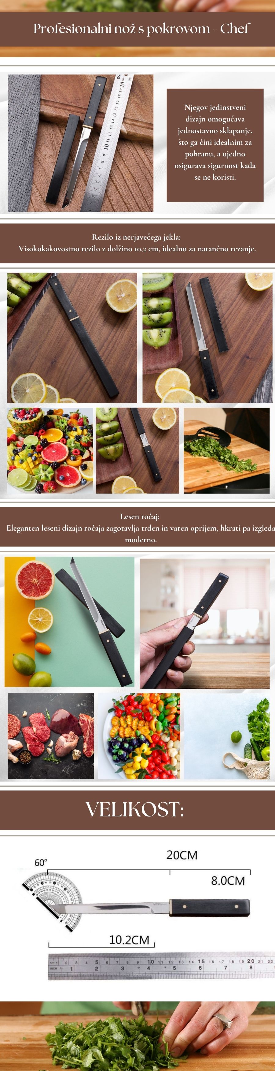Primeren za profesionalne kuharje in domačo uporabo, ta zložljiv nož prinaša eleganco in funkcionalnost v vašo kuhinjo.