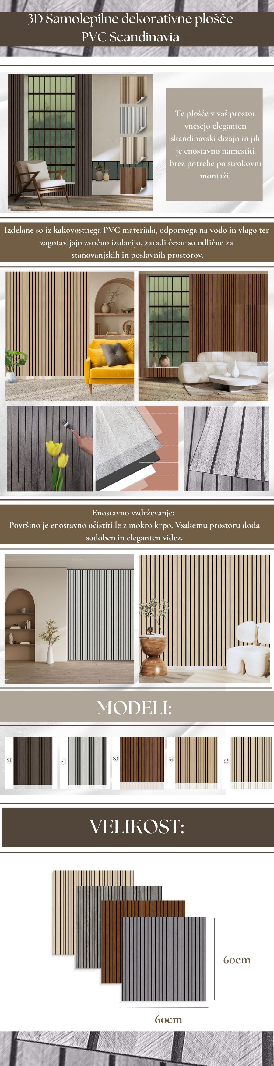 Izboljšajte videz svojega doma s Scandinavia samolepilnimi stenskimi ploščami. Njihov eleganten dizajn in trpežna zasnova bodo takoj posodobili vaš prostor, hkrati pa zagotovili funkcionalne in estetske koristi. Naročite svoje plošče še danes!