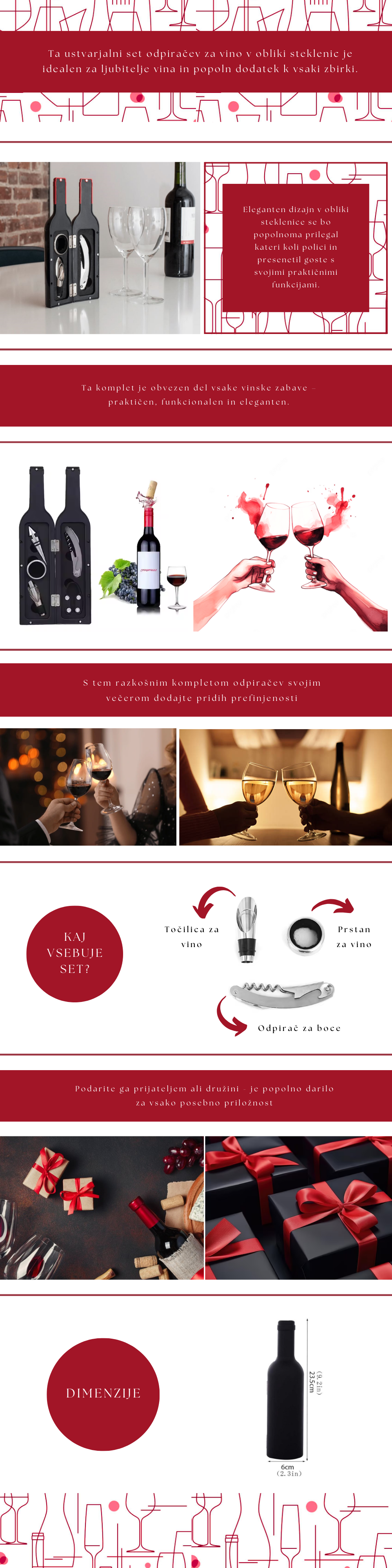 Presenetite ljubitelje vina z elegantnim in funkcionalnim setom za vino v obliki steklenice. Ta set je na voljo v luksuzni črni darilni škatli, ki posnema videz vinske steklenice, popoln za shranjevanje in predstavitev. Set vsebuje vse, kar potrebujete za odpiranje, postrežbo in uživanje v najljubšem vinu.. Narejen iz visokokakovostnih materialov, je ta set trpežen in enostaven za uporabo. Idealno darilo za posebne priložnosti, kot so rojstni dnevi, obletnice ali prazniki, in se odlično prilega vsakemu gospodinjstvu ljubiteljev vina.