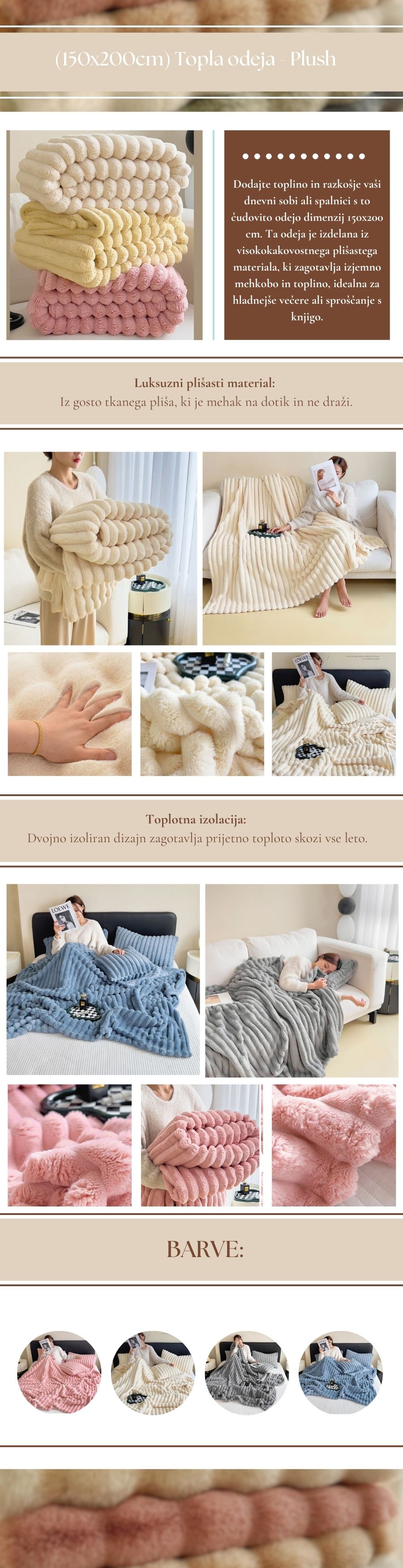 Preprosto jo razgrnite po kavču ali postelji. Zaradi svoje prostorne velikosti je primerna tudi za dve osebi. Prijeten material je idealen za otroke in odrasle.