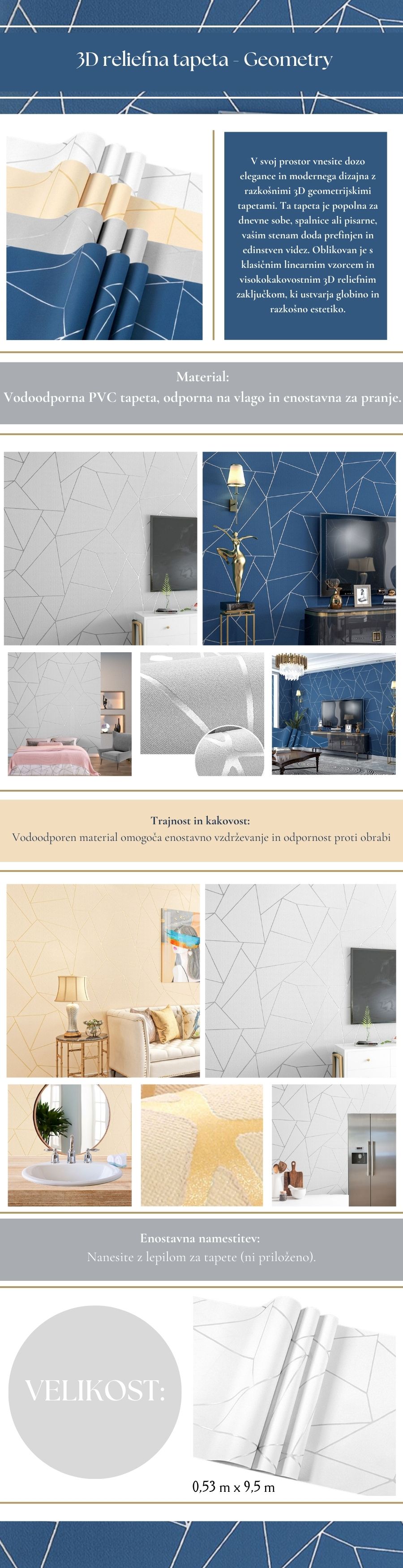 Dodajte pridih elegance in modernega dizajna svojemu prostoru z luksuzno 3D geometrijsko tapeto. Ta tapeta je idealna za dnevne sobe, spalnice ali pisarne, saj stene spremeni v elegantno in edinstveno dekoracijo. Oblikovana je s klasičnim linijskim vzorcem in kakovostnim 3D reliefnim zaključkom, ki dodaja globino in prestiž.