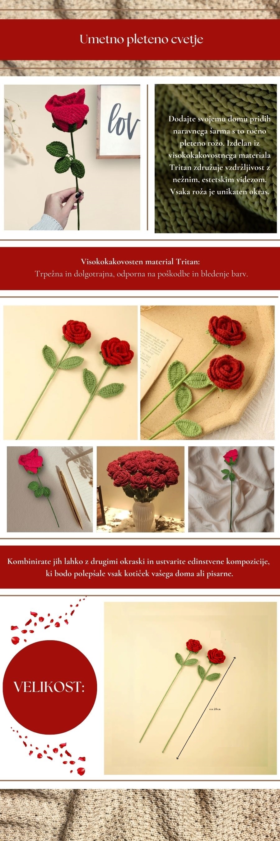 • Ročno izdelano:Vsaka roža je skrbno pletena ročno, z ljubeznijo in pozornostjo do podrobnosti.