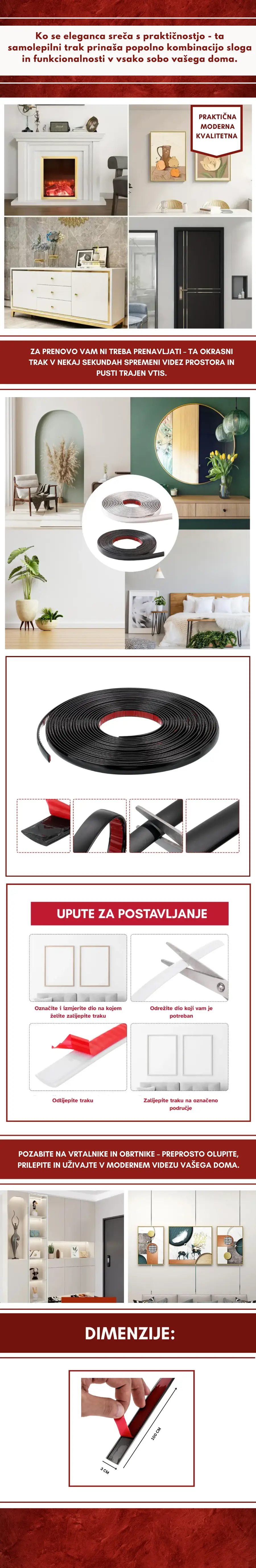 V svoj dom vnesite moderno eleganco s samolepilnim okrasnim trakom, ki je na voljo v luksuzni črni in prefinjeni srebrni barvi. Ta trak je odlična izbira za vse, ki želite hitro in enostavno osvežiti prostor brez dodatnega orodja ali mojstrov. Idealen je za zaključno obdelavo sten, tal, kuhinjskih ploščic, vrat, okenskih okvirjev ali katere koli druge ravne površine.Ključne značilnosti: