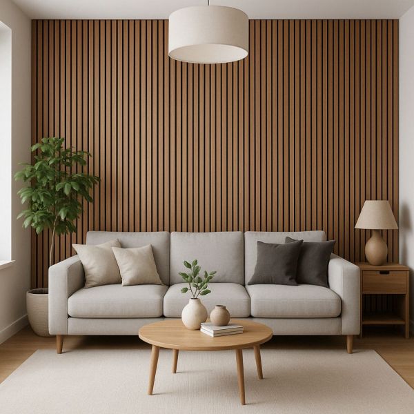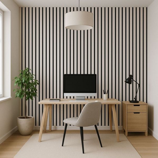 Lep in praktičen dizajn: Kombinacija dekorativnih lesenih letvic in akustične funkcije za vrhunski učinek.