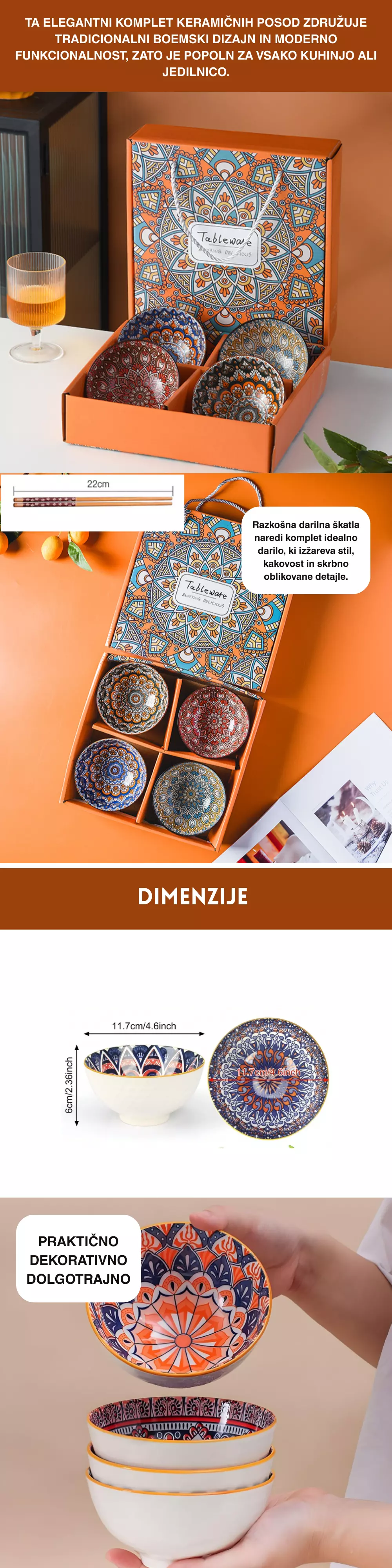 Eleganten set štirih keramičnih skodelic v boemsko-marakeškem stilu, zapakiran v prestižno darilno škatlo. Izdelane iz kakovostnega porcelana, skodelice so popolne za serviranje hrane, posebne priložnosti ali kot izvirno darilo.
