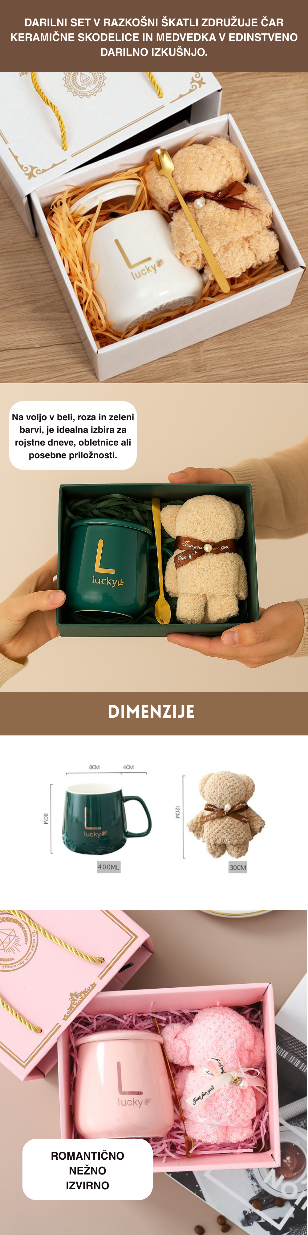 Eleganten darilni set v nordijskem slogu vsebuje keramično skodelico in plišastega medvedka, zapakirana v prestižno darilno škatlo. Na voljo v treh modernih barvah – beli, roza in zeleni – ta set je popolna izbira za rojstne dneve, obletnice ali druge posebne priložnosti.