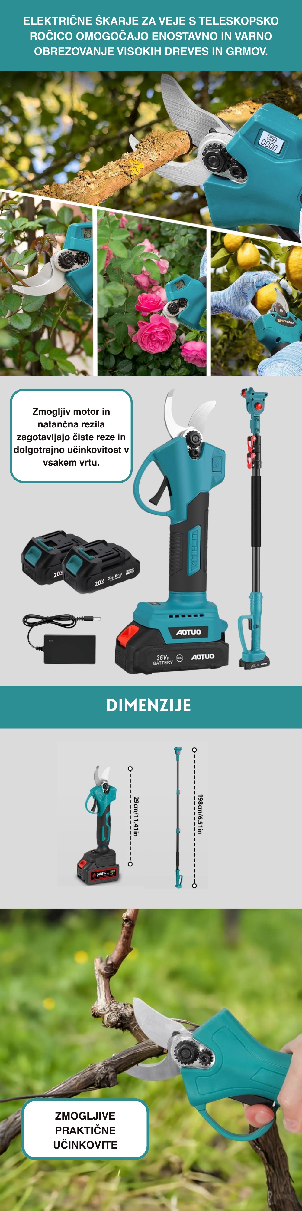 Električne škarje za veje s teleskopsko ročico – set z baterijo in polnilcem