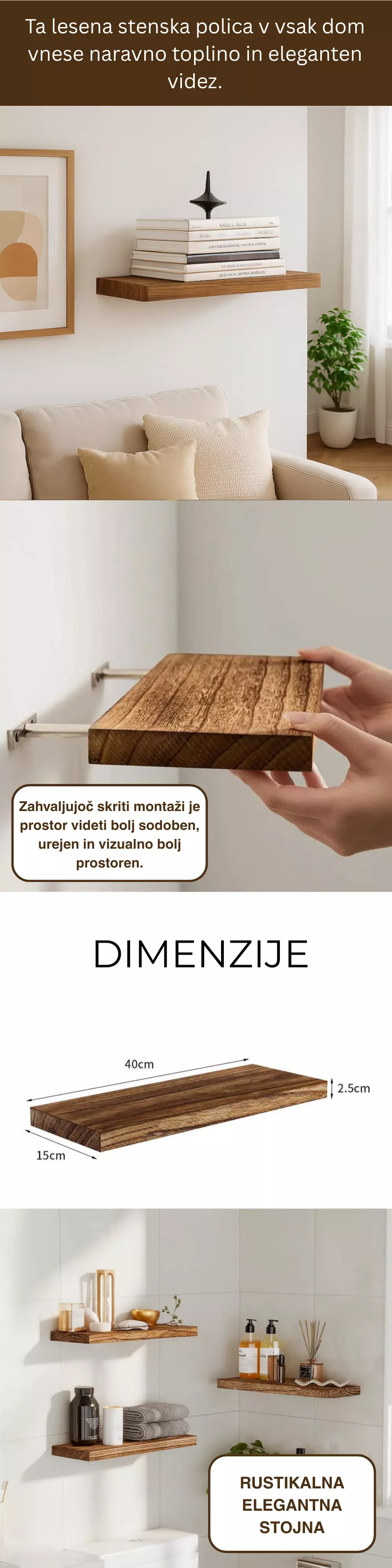 Vnesite toplino naravnega lesa v svoj dom s to elegantno stensko polico iz visokokakovostnega in trpežnega materiala. Minimalistična oblika se popolnoma prilega v vsako notranjost – dnevno sobo, kuhinjo, hodnik ali delovni prostor. Polica je idealna za okraske, rastline, sveče, fotografije in druge majhne predmete, ki jih želite poudariti. Zahvaljujoč skritemu sistemu pritrditve je namestitev hitra in enostavna, polica pa je videti, kot da lebdi na steni, kar prostoru daje sodoben in urejen videz. Lesena površina ima naravno teksturo, ki prostoru doda dodatno toplino in estetsko vrednost.