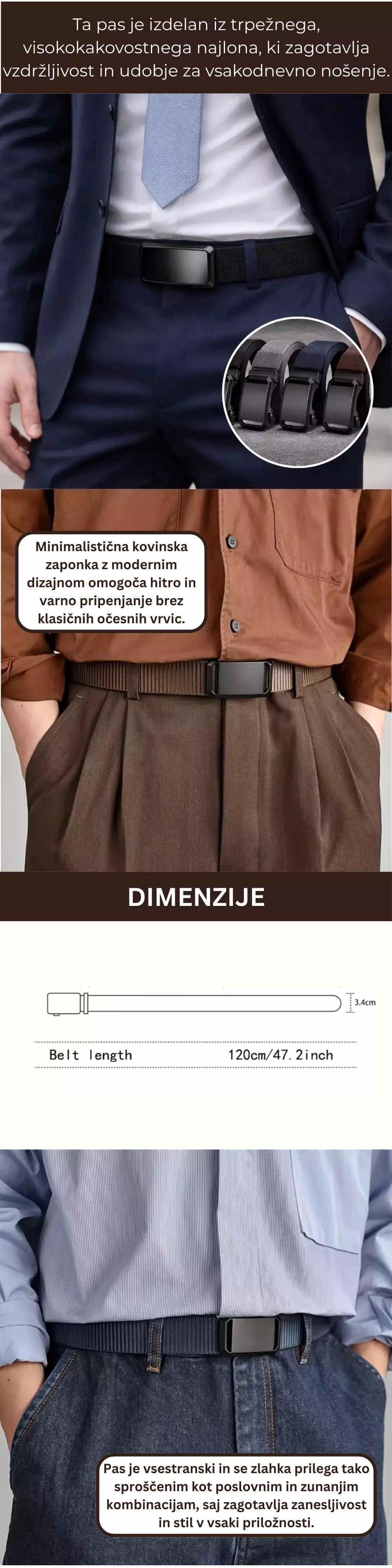 Avtomatska zaponka omogoča hitro in natančno prilagajanje brez lukenj, nevtralne barve pa zagotavljajo enostavno kombiniranje z različnimi oblačili.