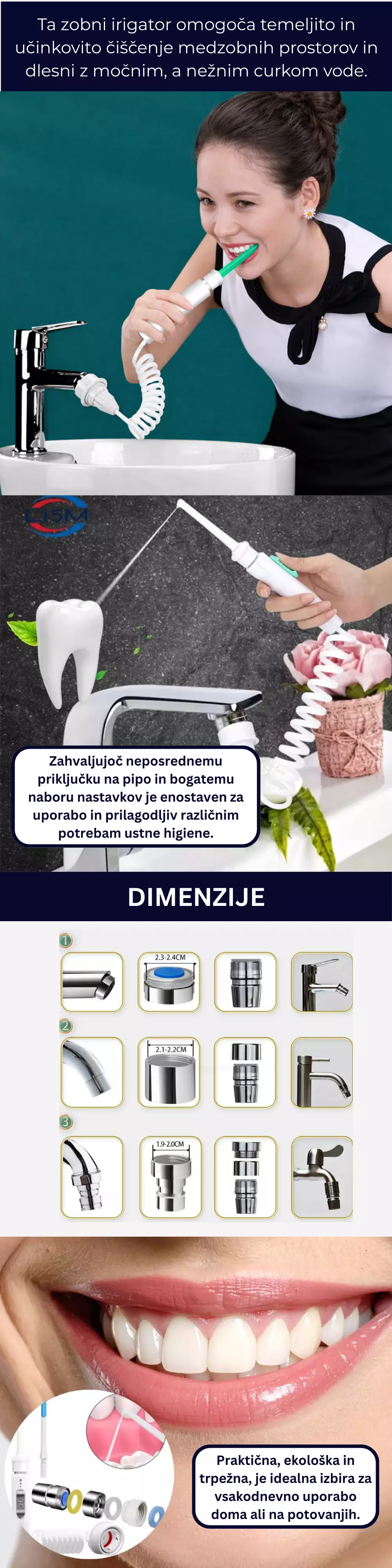 Ta praktični zobni irigator učinkovito odstranjuje ostanke hrane in zobne obloge s težko dostopnih mest med zobmi in ob dlesnih. Je idealen dodatek k vsakodnevni ustni higieni, še posebej za osebe z zobnim aparatom, implantati ali občutljivimi dlesnimi. Enostavno se priključi neposredno na pipo, ne potrebuje baterij ali električne energije ter omogoča močan, a hkrati nežen curek vode za temeljito čiščenje. Zaradi kompaktne in lahke zasnove je primeren tudi za potovanja.