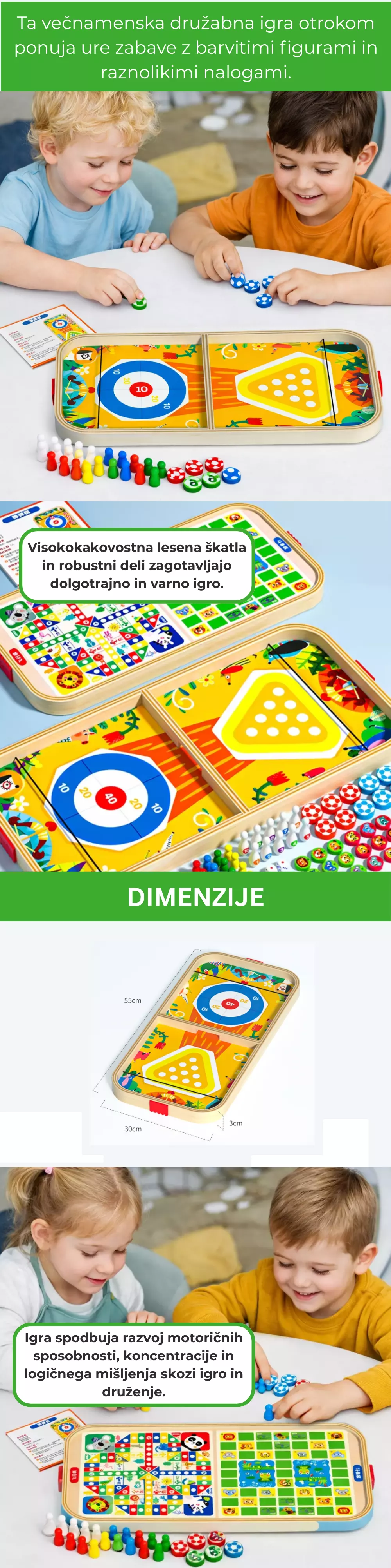 Ta praktičen dvostrani večnamenski set družabnih iger ponuja ure zabave za otroke in odrasle. V enem kompletu dobite več priljubljenih iger kot človek ne jezi se, pikado in druge zabavne igre, idealne za družinske večere, potovanja in druženja s prijatelji.