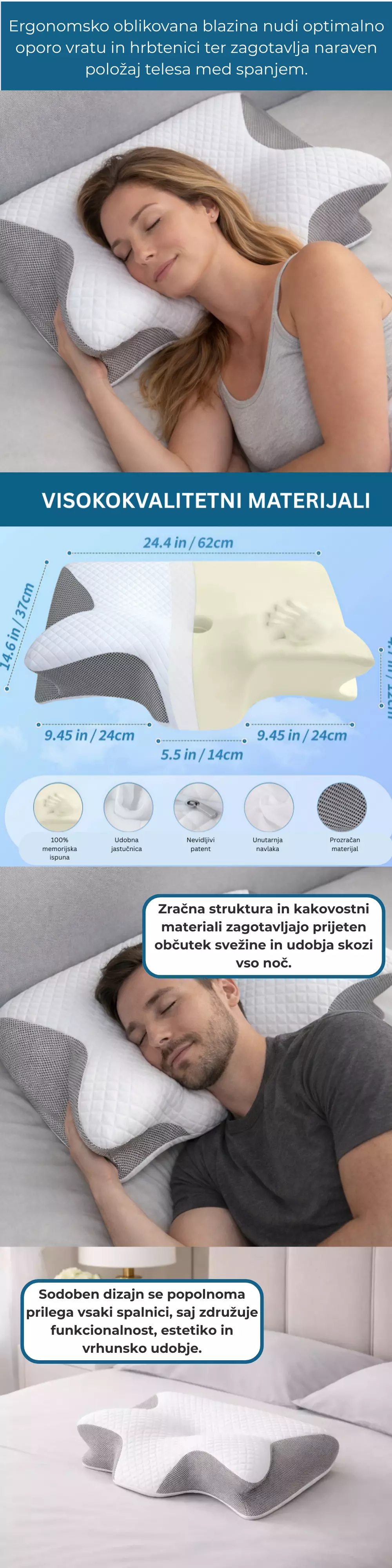 Ergonomski vzglavnik iz spominske pene je zasnovan za pravilno poravnavo vratu in hrbtenice med spanjem. Posebna metuljasta oblika zmanjšuje pritisk na vrat, ramena in glavo ter zagotavlja udobje v vseh spalnih položajih. Zračna prevleka omogoča svež in prijeten spanec skozi celo noč.
