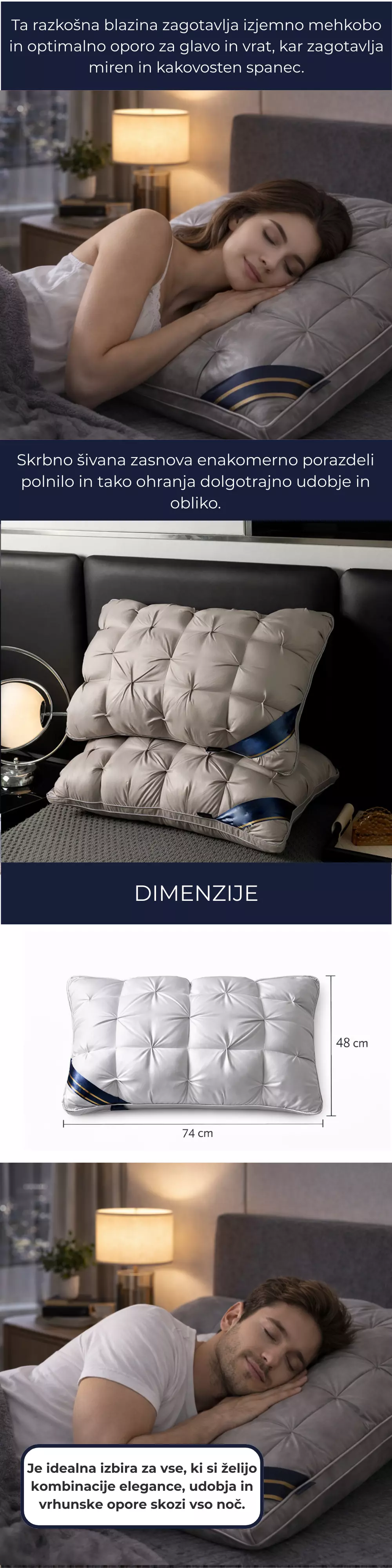 Uživajte v vrhunskem udobju s 3D prešito blazino dimenzij 74x48 cm, ki nudi optimalno podporo glavi in vratu. Elegantna prešita zasnova zagotavlja enakomerno porazdelitev polnila in dolgotrajno ohranjanje oblike. Primerna je za vsakodnevno uporabo doma, v apartmajih ali hotelih.
