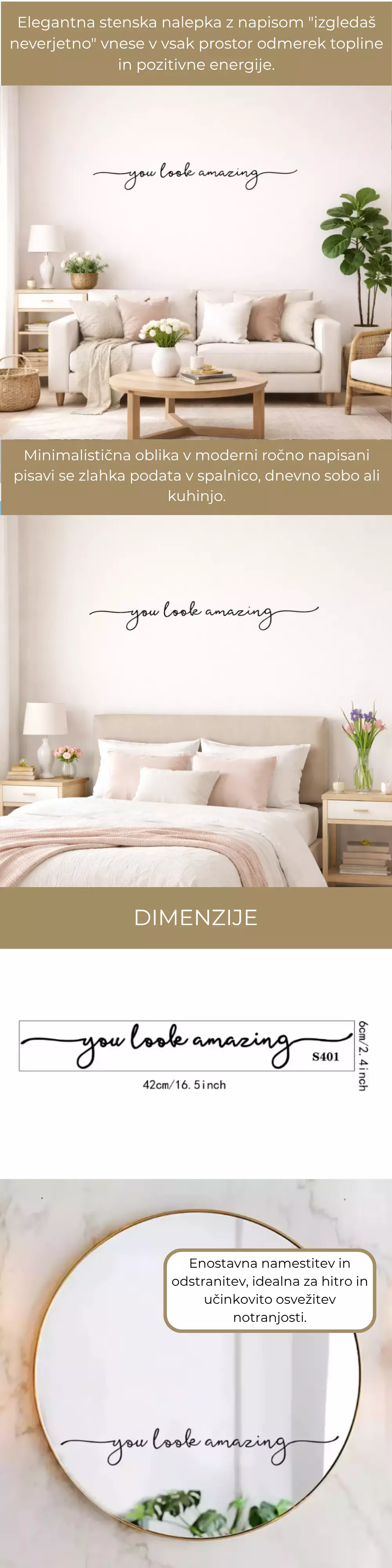 Dodajte poseben poudarek svojemu prostoru s elegantno stensko nalepko z motivacijskim napisom “You look amazing”. Popolna je za ogledala, spalnice, hodnike ali kozmetične kotičke, kjer želite ustvariti pozitiven občutek in moderen videz. Minimalističen dizajn se lepo poda v vsak interier.