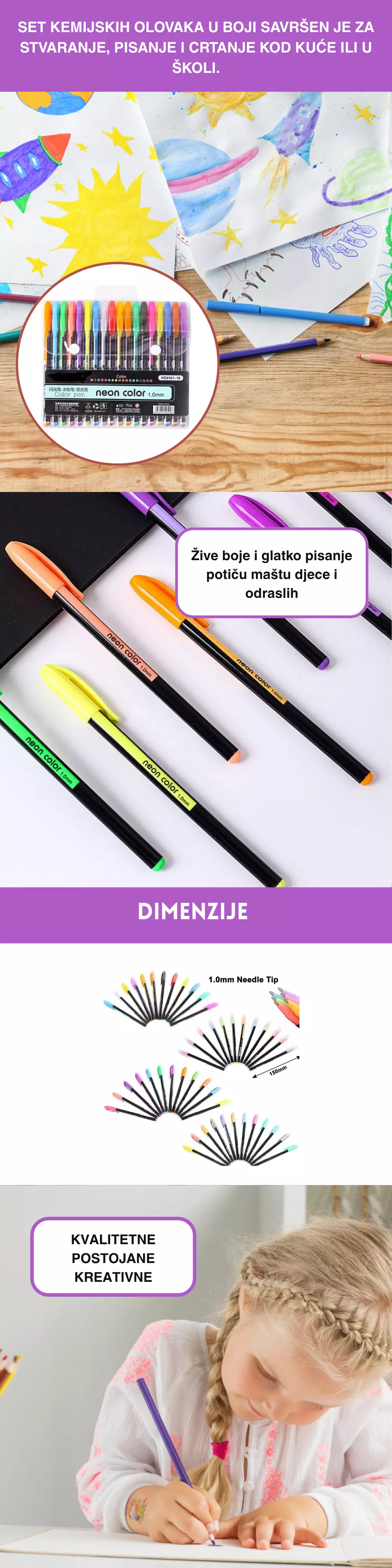 Ovaj praktičan set od 18 kemijskih olovaka u boji sadrži raznolike nijanse koje su idealne za crtanje, pisanje, bojanje i označavanje. Kemijska olovka ima vrh debljine 1.0 mm koji omogućuje precizno nanošenje boje bez razmazivanja. Boje su živopisne, postojane i brzosušeće, što ih čini savršenim izborom za školu, ured ili kreativne hobije.