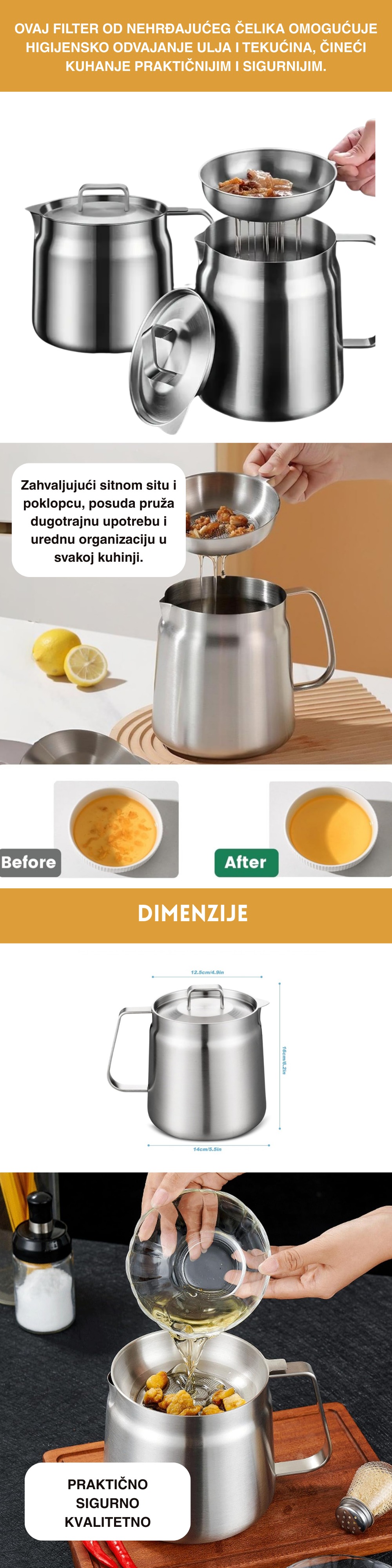 Praktičan spremnik za ulje od nehrđajućeg čelika 304 s uklonjivim sitom i poklopcem idealan je za kućanstva koja žele odvajati ulje, mast i ostatke prženja. Zahvaljujući otpornom materijalu i jednostavnom dizajnu, posuda osigurava dugotrajnu upotrebu i olakšava kuhanje. Dostupna je s dodatnom košarom za prženje za još veću funkcionalnost.
