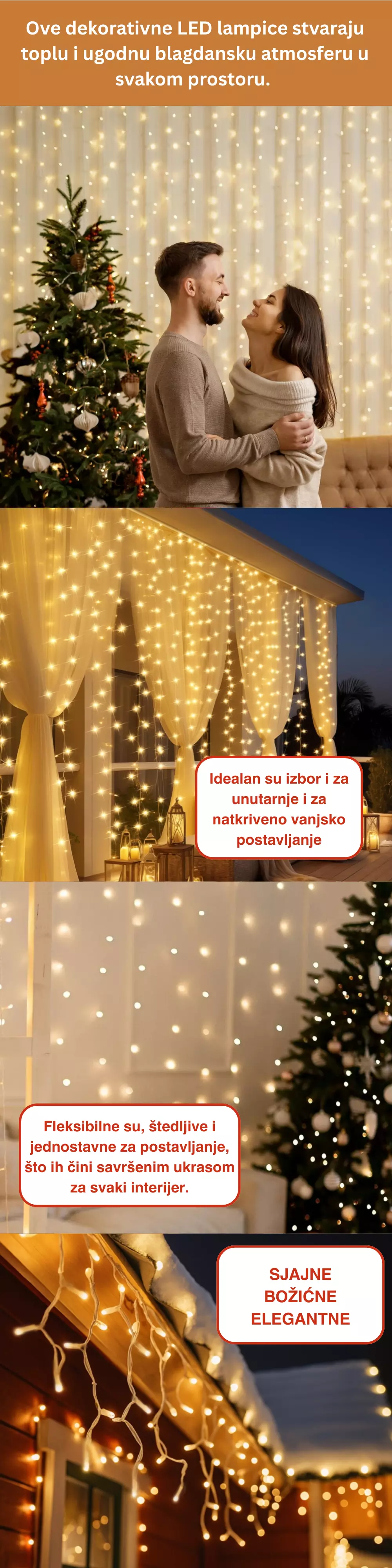 Unesite toplu i ugodnu atmosferu u svoj dom uz ove dekorativne LED lampice dužine 5 metara. Savršene su za blagdane, zabave, vjenčanja ili jednostavno za stvaranje romantičnog ugođaja u vašem prostoru. Toplo bijelo svjetlo stvara mekani sjaj koji ističe svaki detalj dekoracije.
