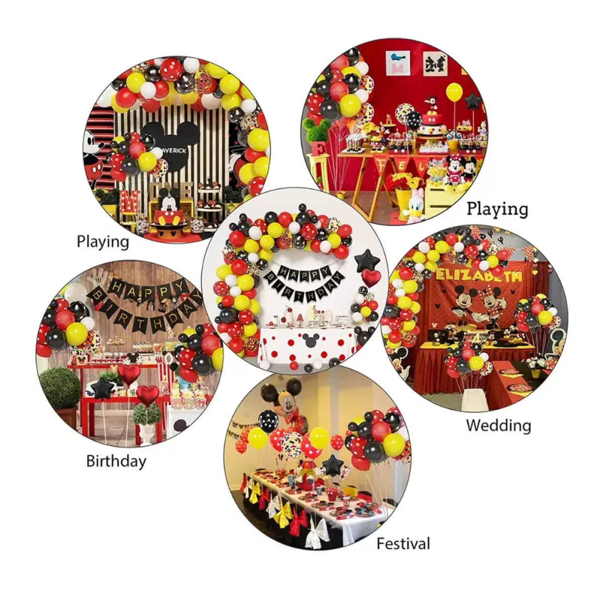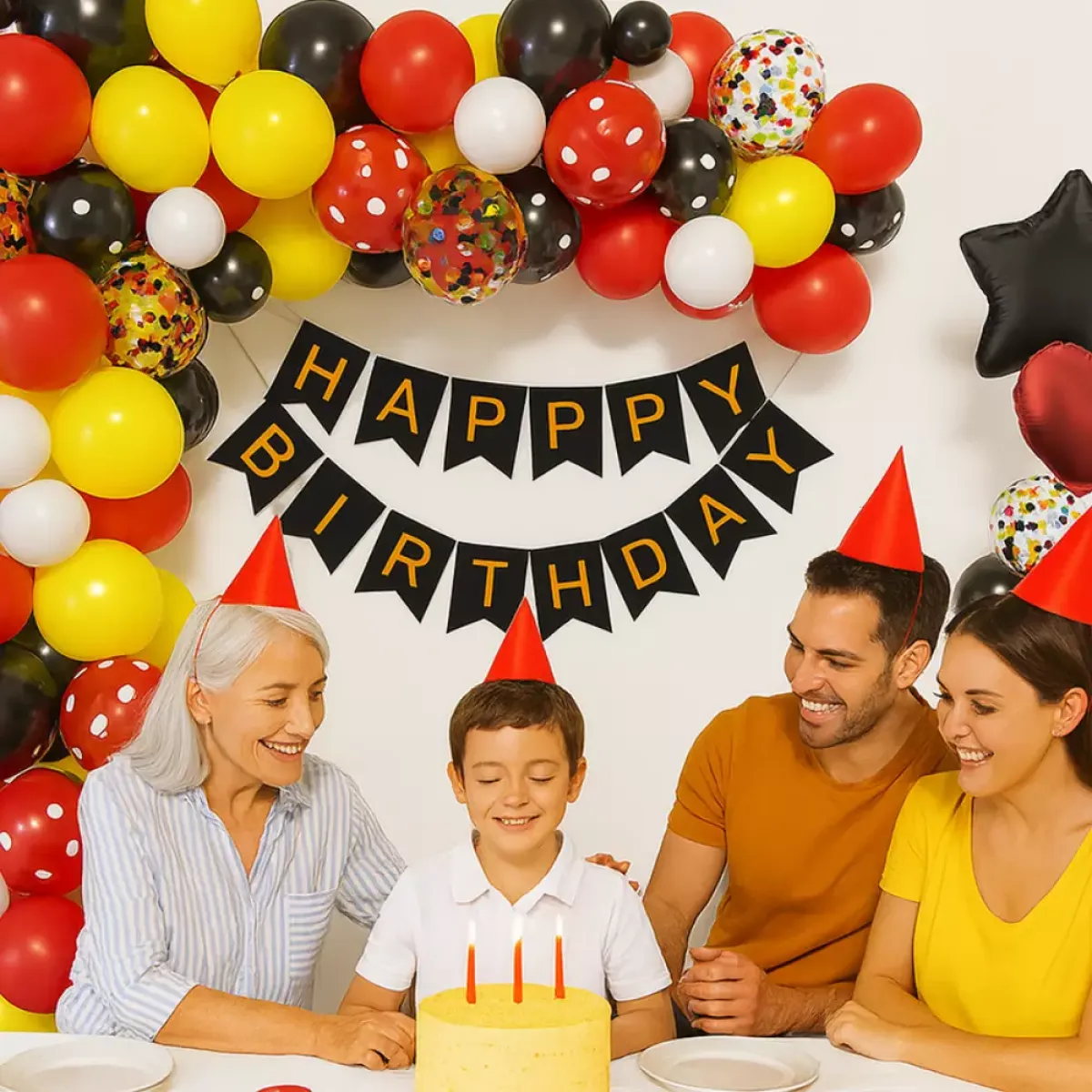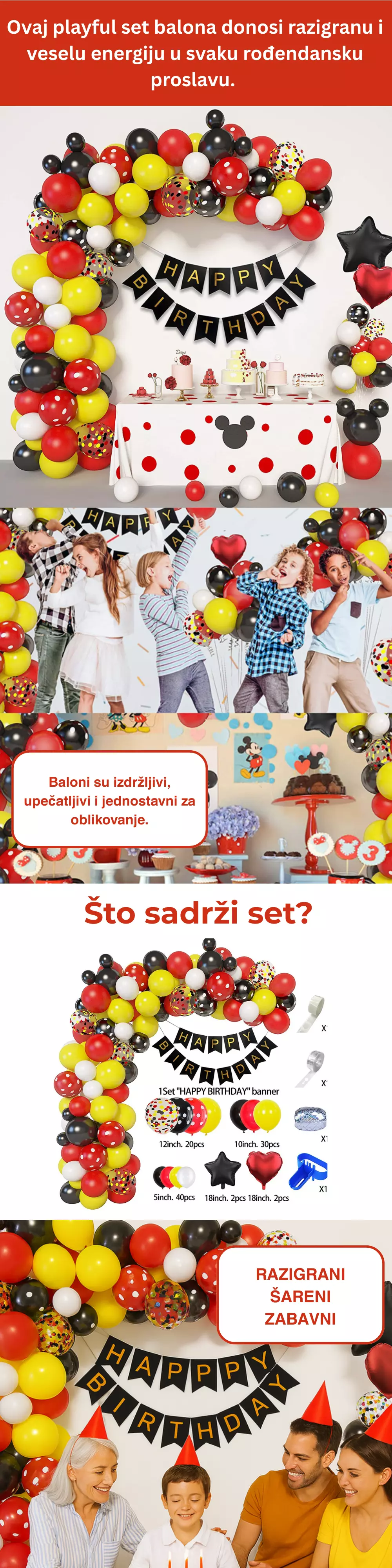 Unesite veselu, razigranu i šarenu atmosferu u svaku proslavu uz ovaj playful rođendanski set balona u crvenoj, žutoj i crnoj boji. Idealan je za dječje rođendane, tematske zabave, party dekoracije i zabavne foto-kutke. Uz bogat izbor balona različitih boja i uzoraka, lako ćete stvoriti raskošan luk od balona koji odvlači pozornost i oduševljava goste.