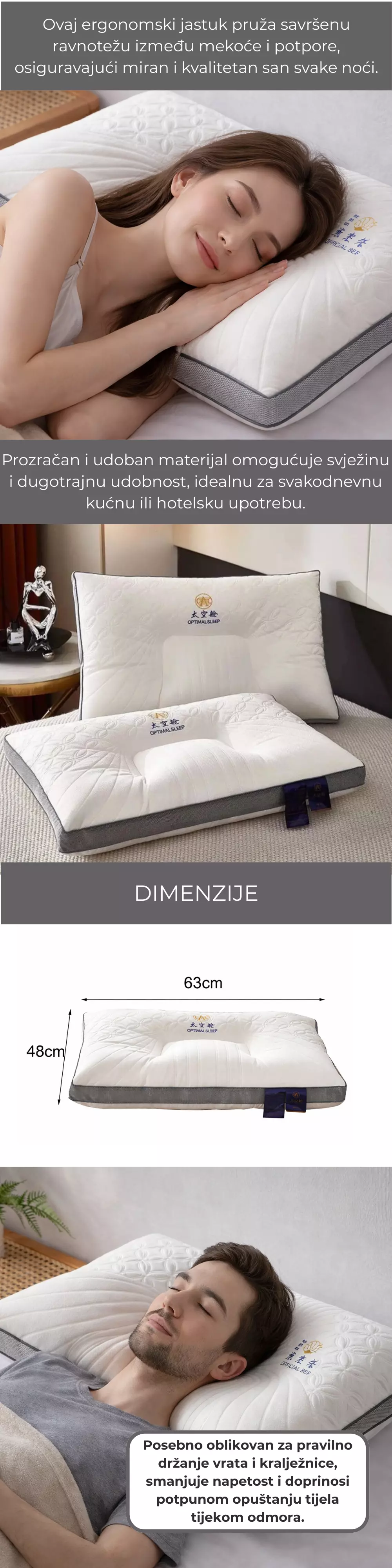 Ergonomski oblikovan jastuk pruža optimalnu potporu vratu i glavi te pomaže u pravilnom položaju kralježnice tijekom spavanja. Dizajniran za maksimalnu udobnost i smanjenje pritiska, idealan je za osobe koje spavaju na leđima ili boku. Kombinacija kvalitetnog punjenja i prozračne navlake osigurava svježinu i dugotrajnu udobnost svake noći.