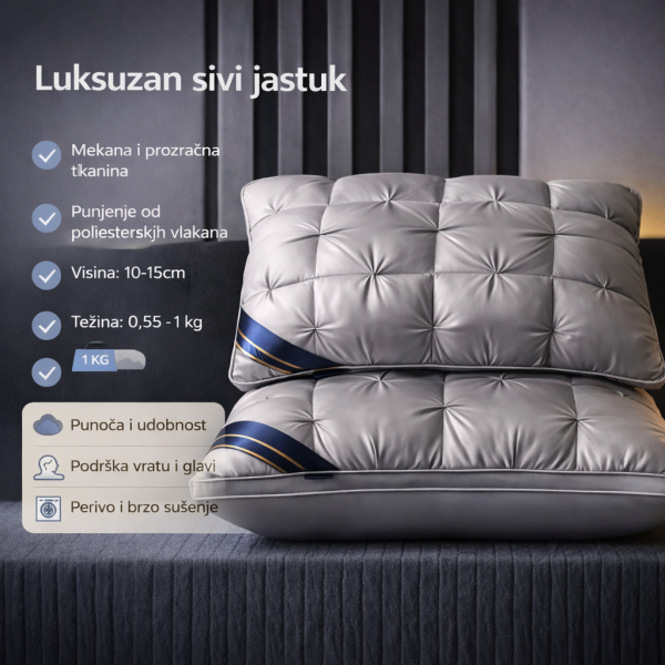 Uživajte u vrhunskoj udobnosti uz luksuzni jastuk dimenzija 74x48 cm koji pruža optimalnu potporu glavi i vratu. Elegantni prošiveni dizajn osigurava ravnomjernu raspodjelu punjenja i dugotrajno zadržavanje oblika. Idealan je za svakodnevnu upotrebu kod kuće, u apartmanima ili hotelima.