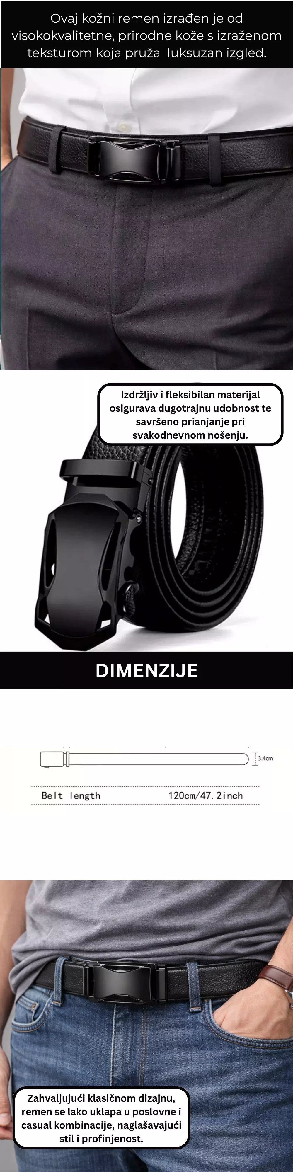 Moderan muški remen s automatskom kopčom savršen je spoj elegancije, funkcionalnosti i udobnosti. Zahvaljujući glatkom mehanizmu kopče, remen se lako podešava bez rupa, pružajući savršeno pristajanje tijekom cijelog dana. Izrađen je od kvalitetnog i izdržljivog materijala, idealan za svakodnevno nošenje, posao, formalne i casual kombinacije.