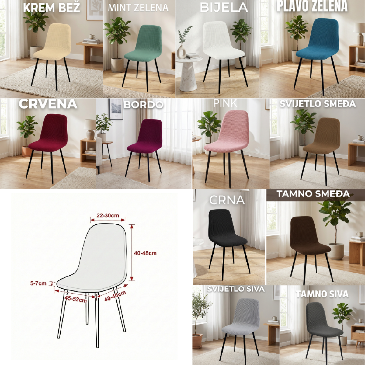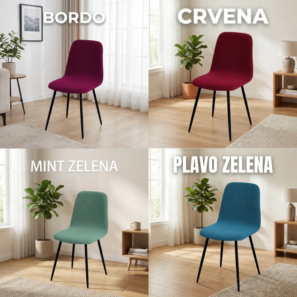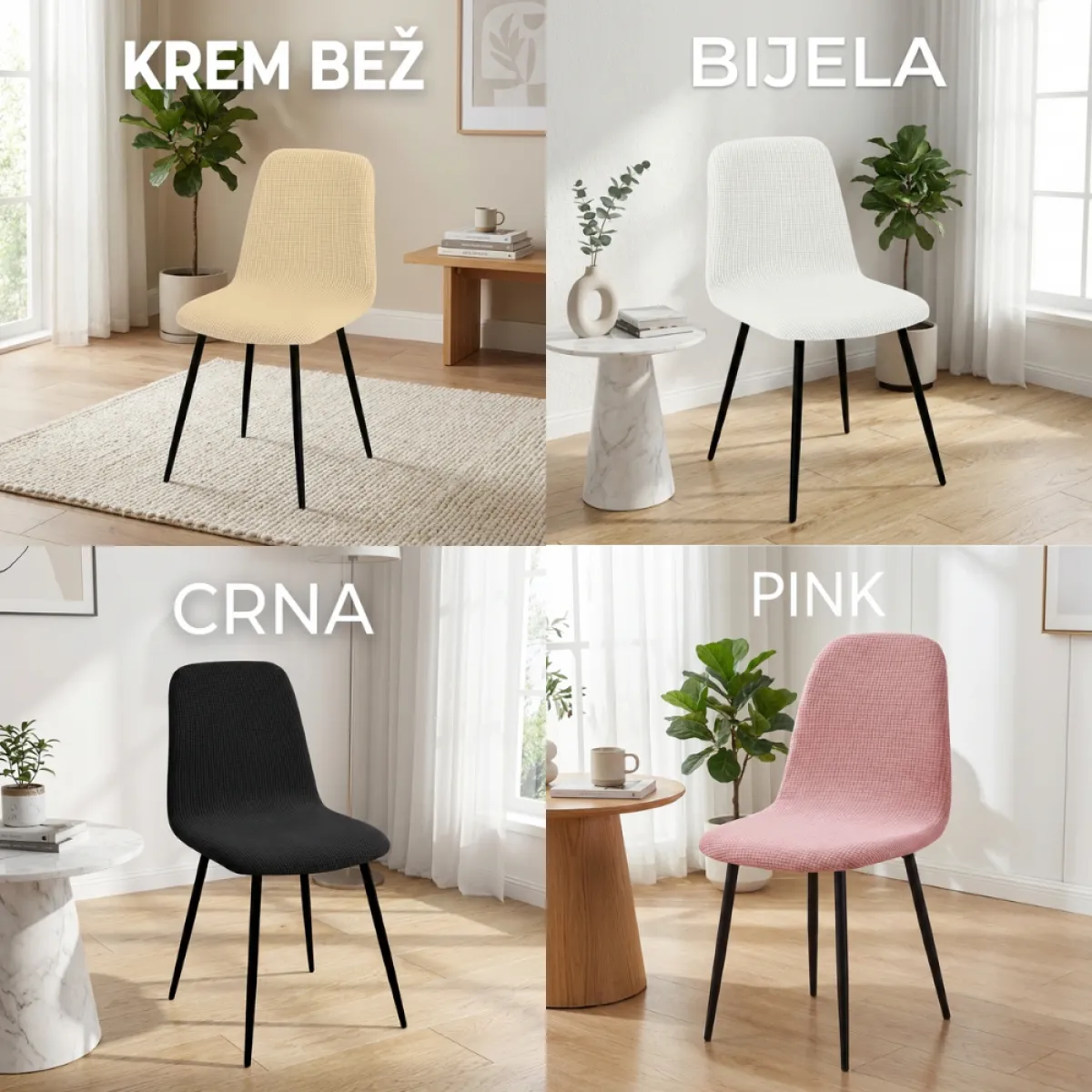 Izrađene od elastičnog, prozračnog i mekanog materijala, navlake se lako postavljaju i čvrsto prianjaju bez nabora. Idealne su za zaštitu od ogrebotina, mrlja i svakodnevnog trošenja, produžujući vijek trajanja vaših stolica. Dostupne su u više modernih boja koje se lako uklapaju u skandinavski ili minimalistički stil uređenja.