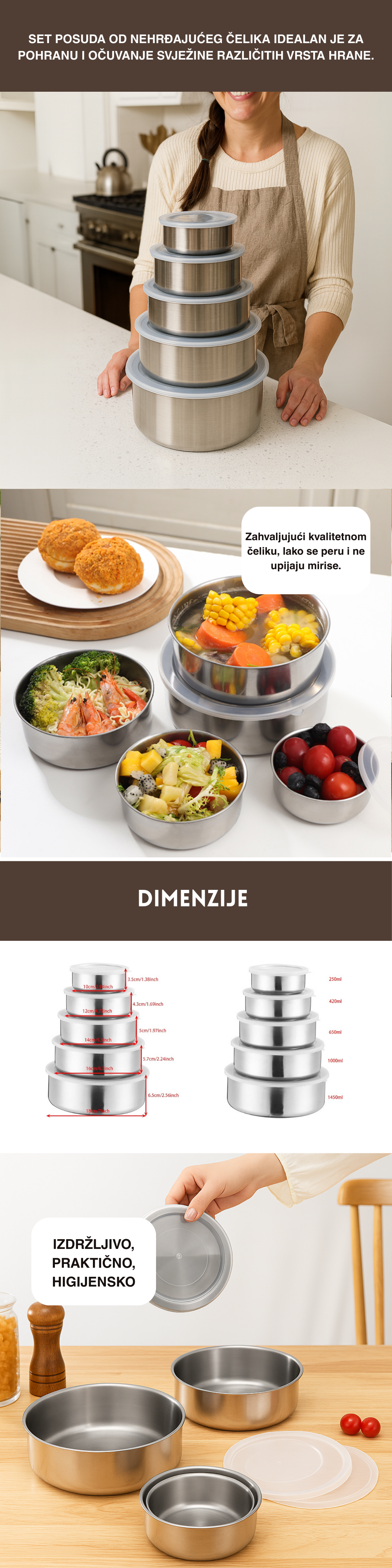 Praktičan set od 5 posuda od nehrđajućeg čelika različitih veličina (250 ml, 420 ml, 650 ml, 1000 ml, 1450 ml). Svaka posuda dolazi s poklopcem koji čuva svježinu i sprječava mirise. Posude su lagane, otporne na koroziju i jednostavne za čišćenje. Idealne za pripremu i čuvanje hrane, slaganje u hladnjak ili ormar te za ponijeti na posao, u školu ili na put.