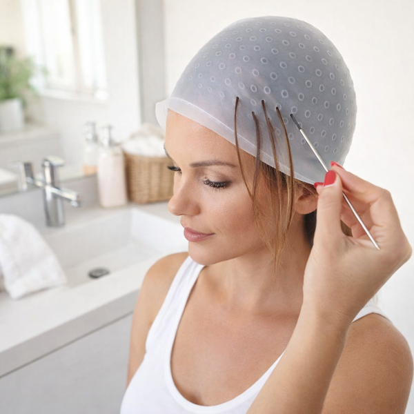 Silikonska kapa za izvlačenje pramenova. Ovisnoi od tehnike izvlačenja, mogu se postići tanji, širi i višebojni pramenovi.