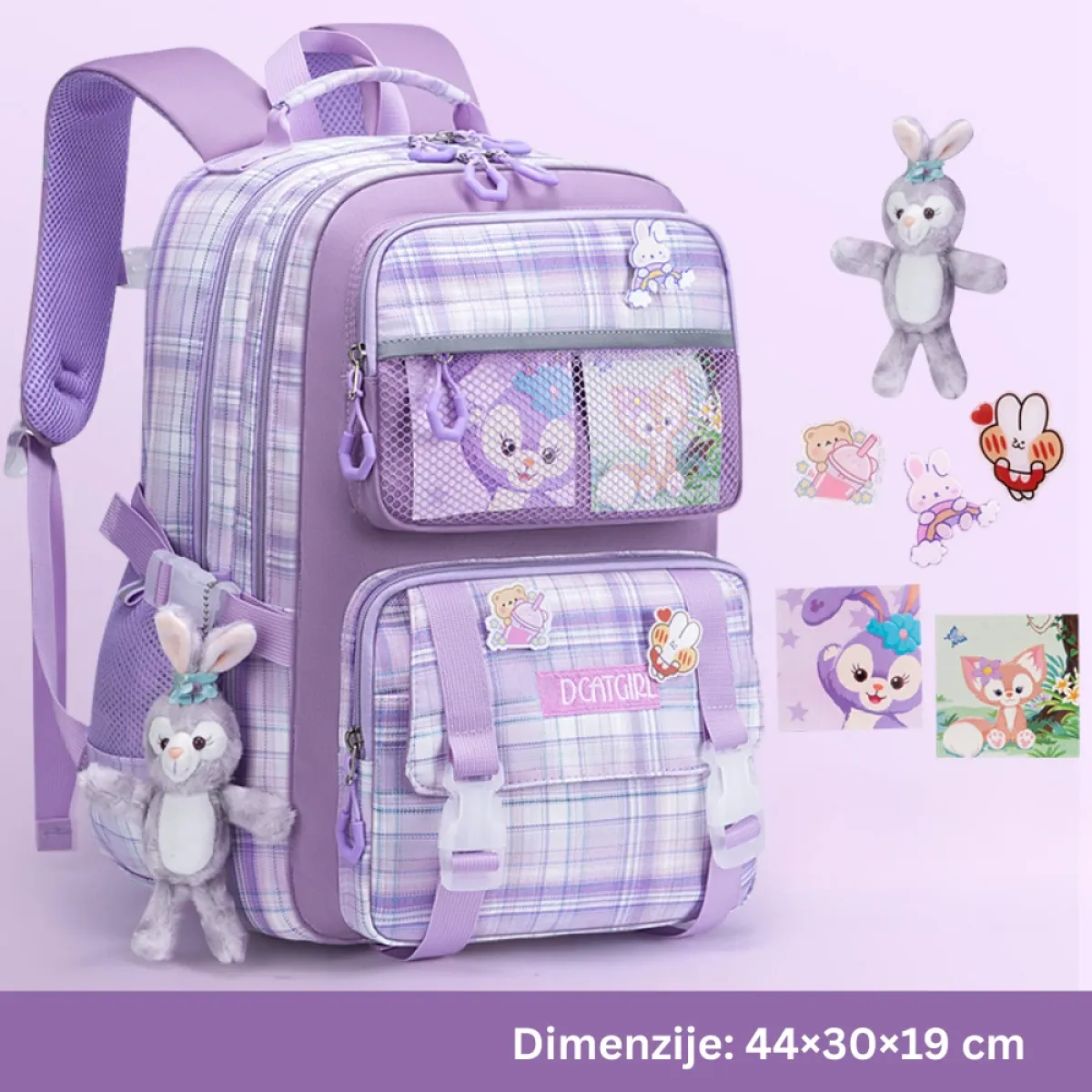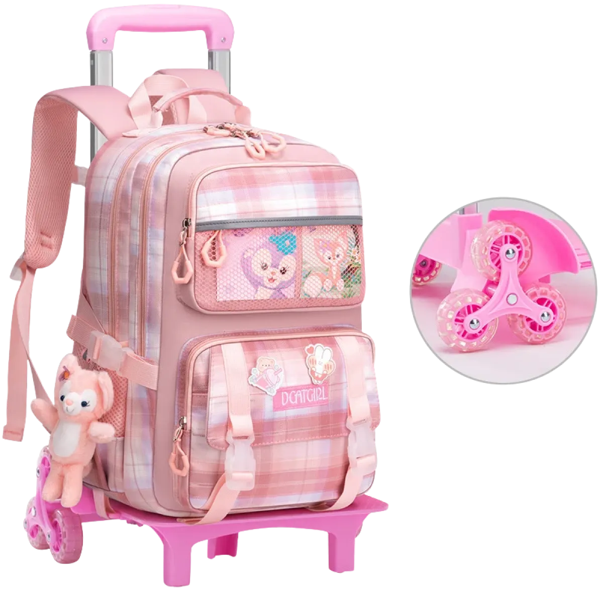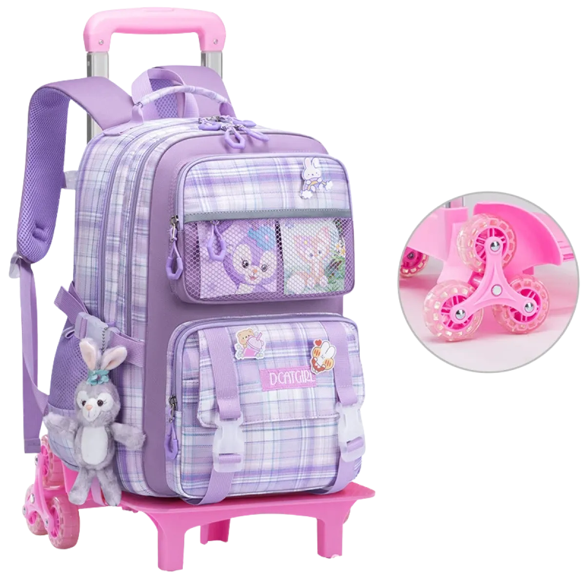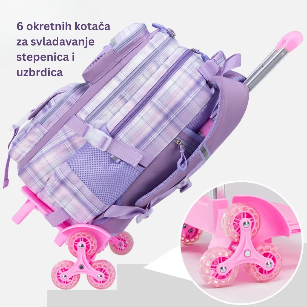 Elegantna i praktična školska torba s kotačićima dostupna je u dvije boje – roza i ljubičasta. Dizajnirana posebno za učenike od 1. do 6. razreda, ova torba nudi dovoljno prostora za knjige, bilježnice i školski pribor. Zahvaljujući šestokotačnom sustavu, dijete torbu može lako vući čak i po stepenicama. Izrađena od kvalitetnog i izdržljivog materijala, torba osigurava dugotrajnu upotrebu, dok atraktivan dizajn i priložena plišana maskota čine školu zabavnijom.