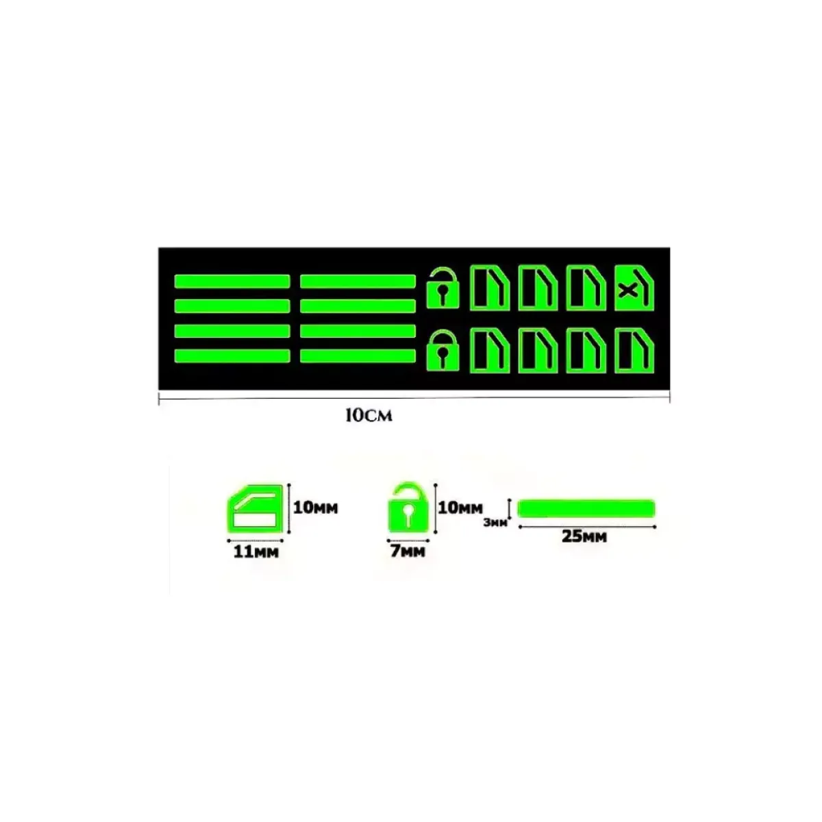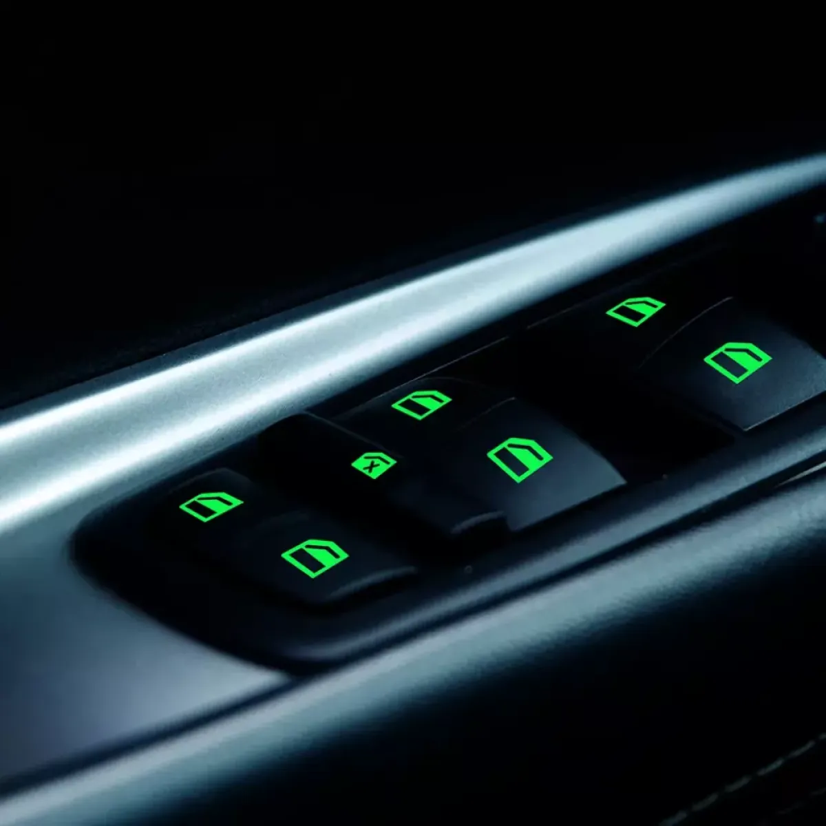 Fluorescentne naljepnice za tipke u automobilu idealne su za poboljšanje vidljivosti u mraku i elegantan izgled unutrašnjosti vozila. Izrađene od kvalitetnog, vodootpornog materijala, jednostavno se lijepe i ne ostavljaju tragove pri uklanjanju. Savršene su za tipke prozora, svjetla, klima uređaja i druge funkcijske prekidače.