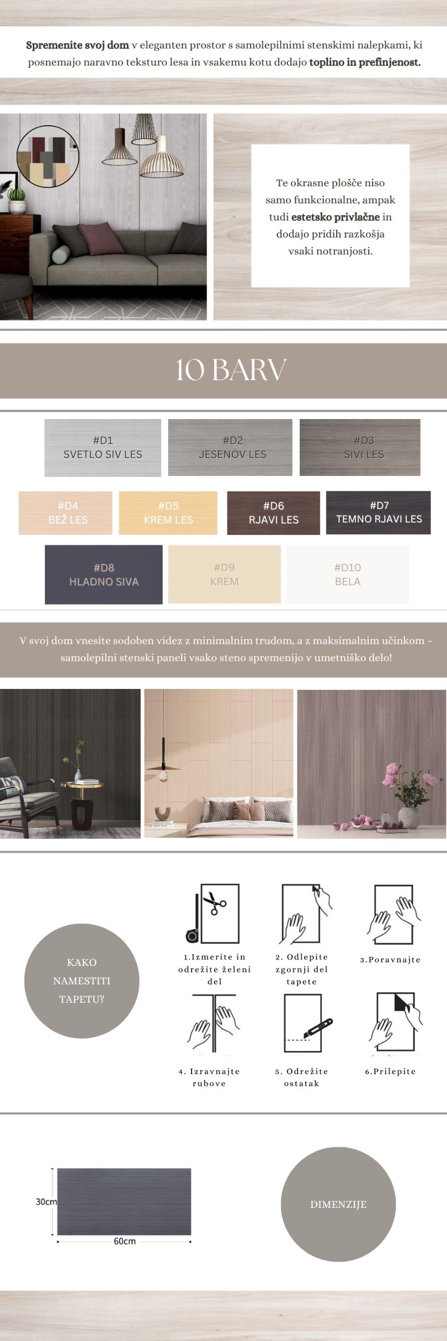 Dodajte pridih elegance svojemu domu z samolepilnimi stenskimi ploščami velikosti 30 x 60 cm. Te moderne plošče popolnoma združujejo slog in funkcionalnost ter zagotavljajo trpežno in estetsko privlačno stensko dekoracijo.